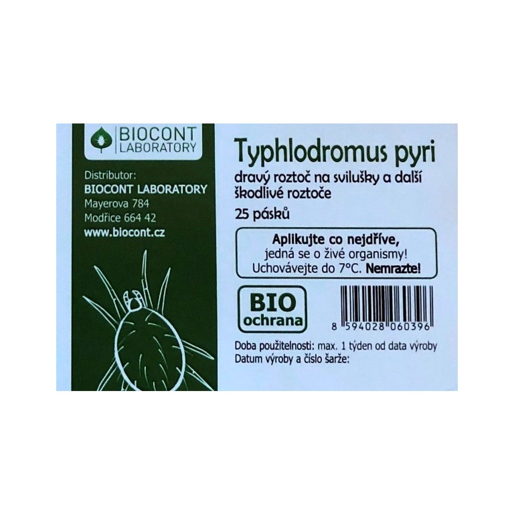 Typhlodromus pyri skladujte v původních obalech v suchých chladných místnostech při teplotě 0- 5°C max. 2 týdny. Chraňte před přímým slunečním svitem. Výrobce nepřebírá odpovědnost za škody vzniklé nesprávným skladováním produktu.